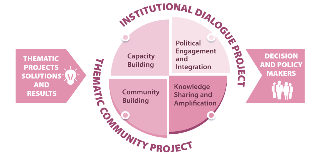 The integrated and complementary actions and activities of the two Governance Projects are structured around 4 complementary pillars to navigate from the transfer and uptake of Projects results to the policy advocacy objectives and namely: Community Building, Capacity Building, Knowledge Sharing and Amplification, Political Engagement and Integration.